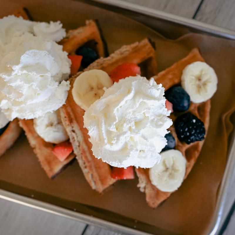 Belgian waffles with fresh fruits and whipped cream | Add vanilla ice cream for $3.00