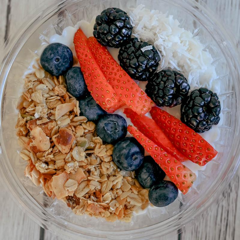 Strawberries, pineapple, organic Greek yogurt, coconut water.