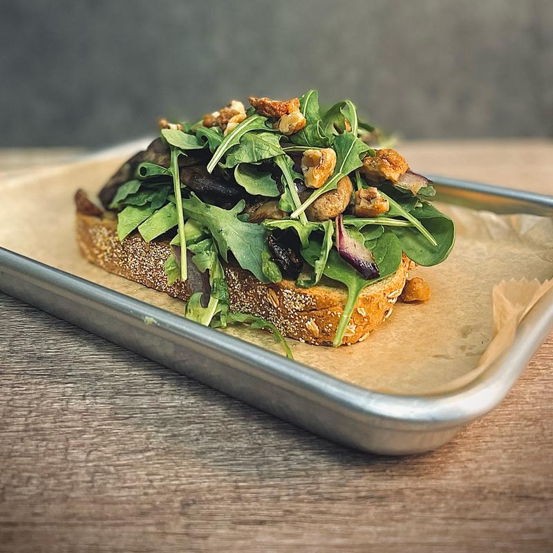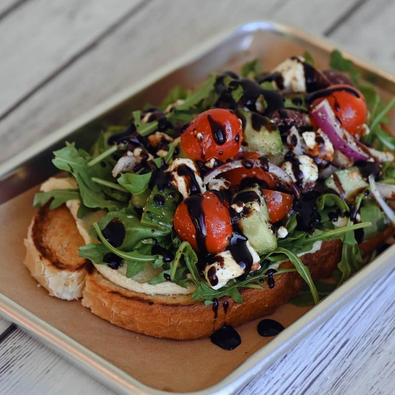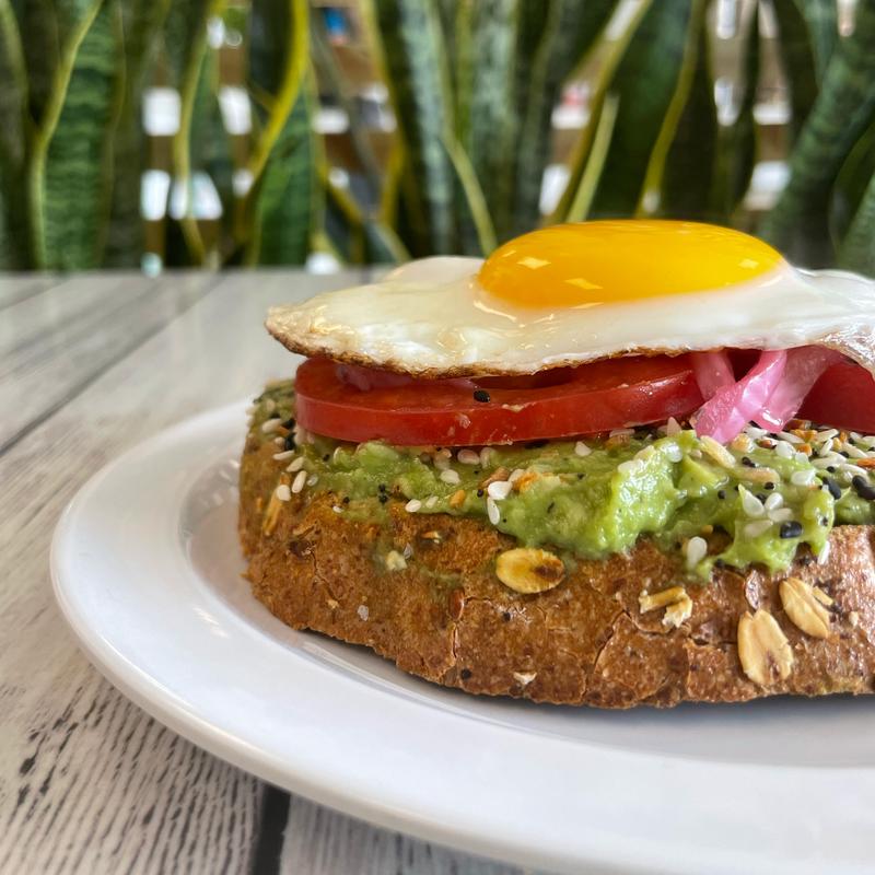 Multigrain toast with smashed avocado, tomatoes, pickled onions, 1 egg any style topped with everything seasoning.