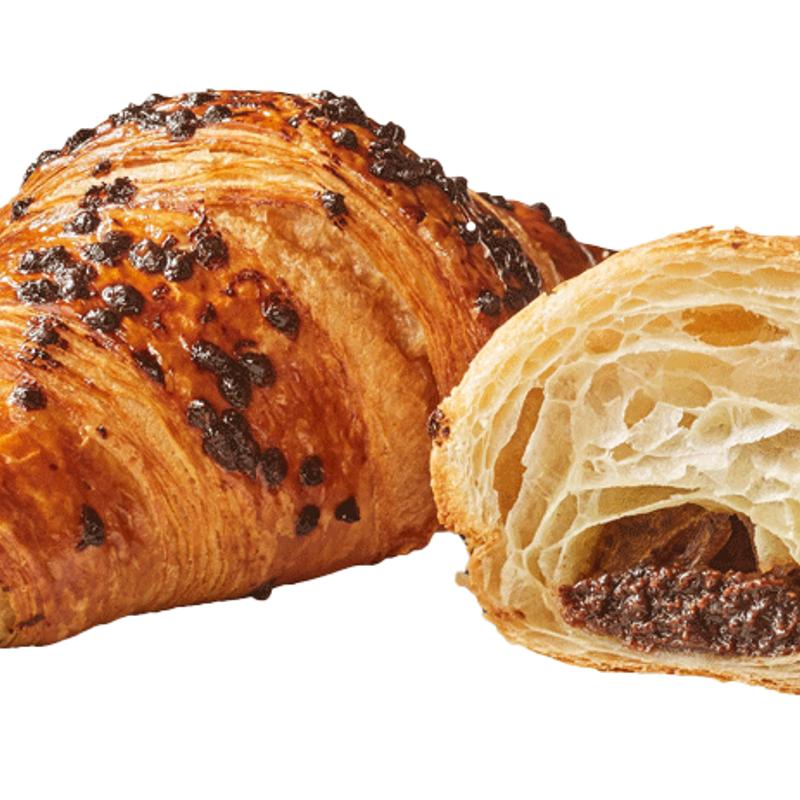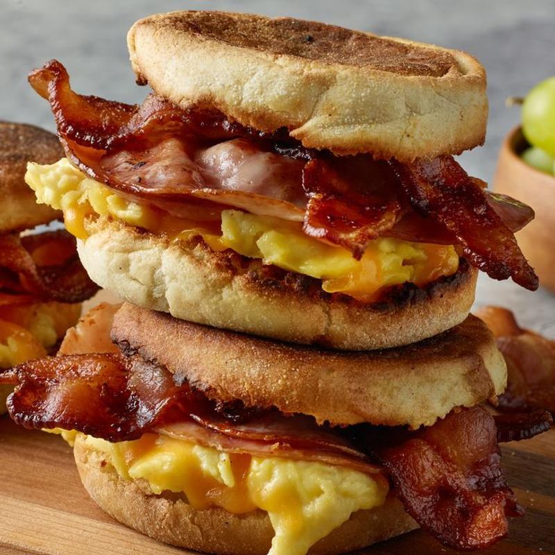 2 Scrambled eggs with 2 slices of bacon, sausage patty, ham and cheddar cheese on a croissant.