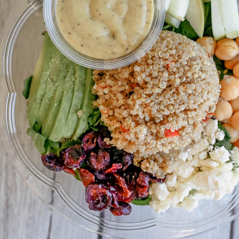 Quinoa with arugula, spinach, green apples, dried craisins, feta cheese, chickpeas, sliced avocado with house made vinaigrette | Add Shredded Chicken breast for $4.00